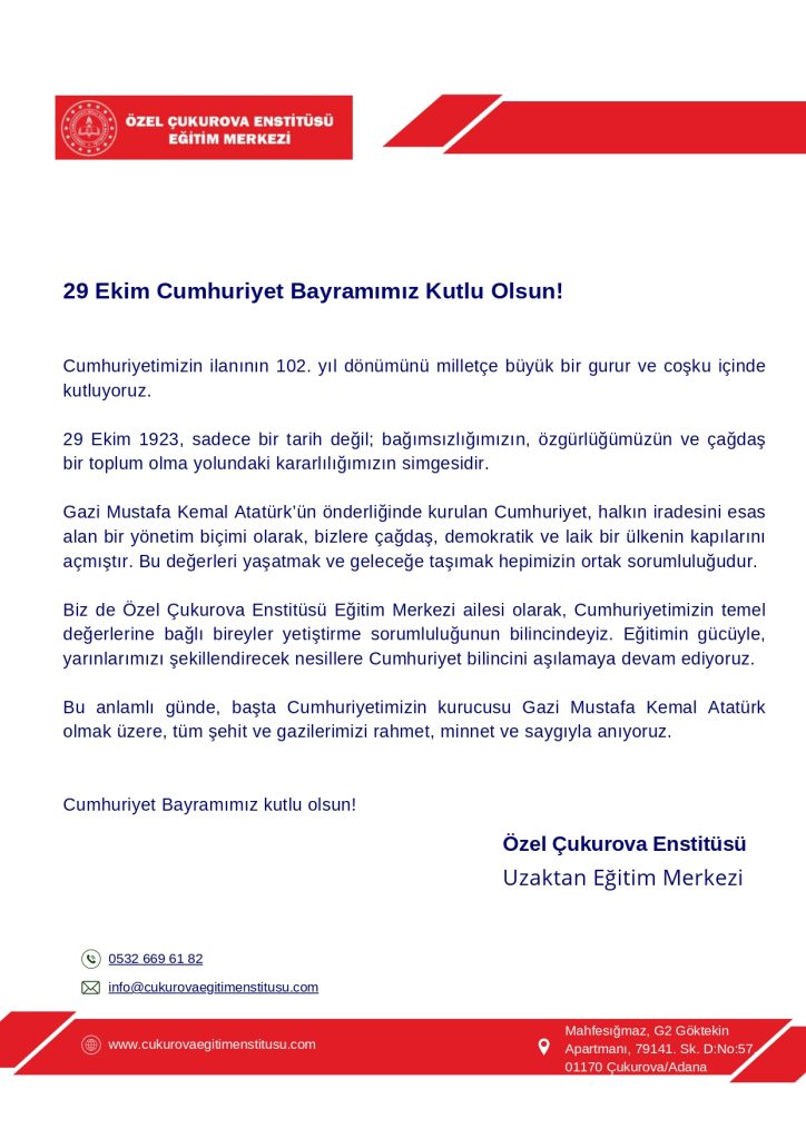 Çukurova Eğitim Enstitüsü Olarak Cumhuriyetimizin 100. Yılına Özel Hazırlamış Olduğumuz Videomuzu İzleyebilirsiniz.